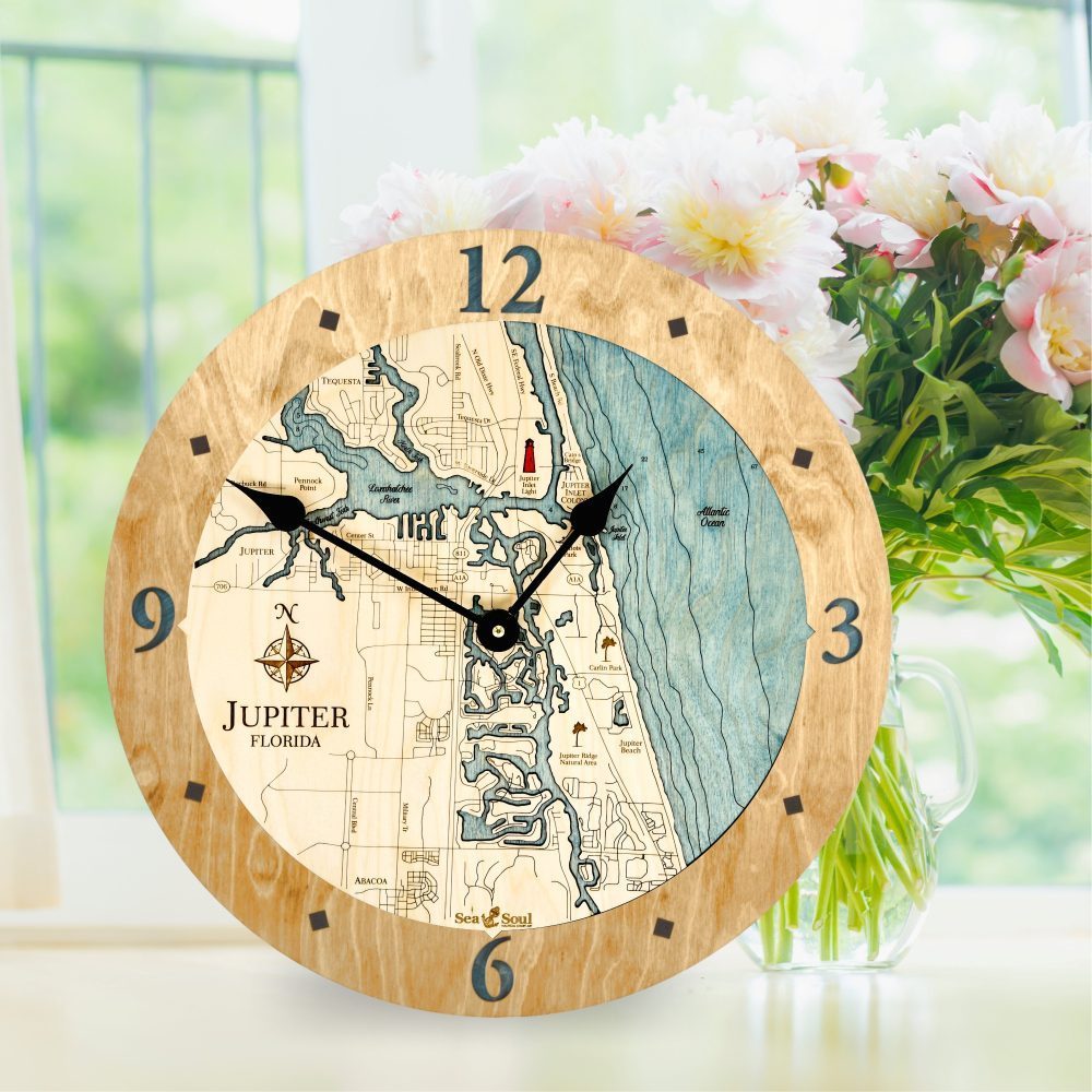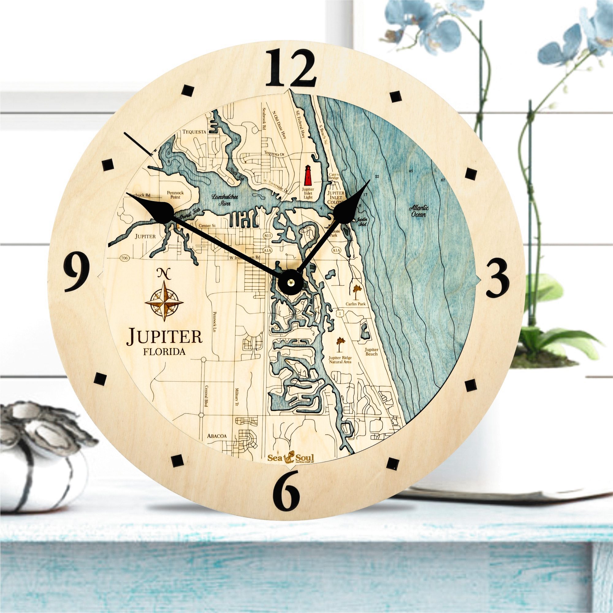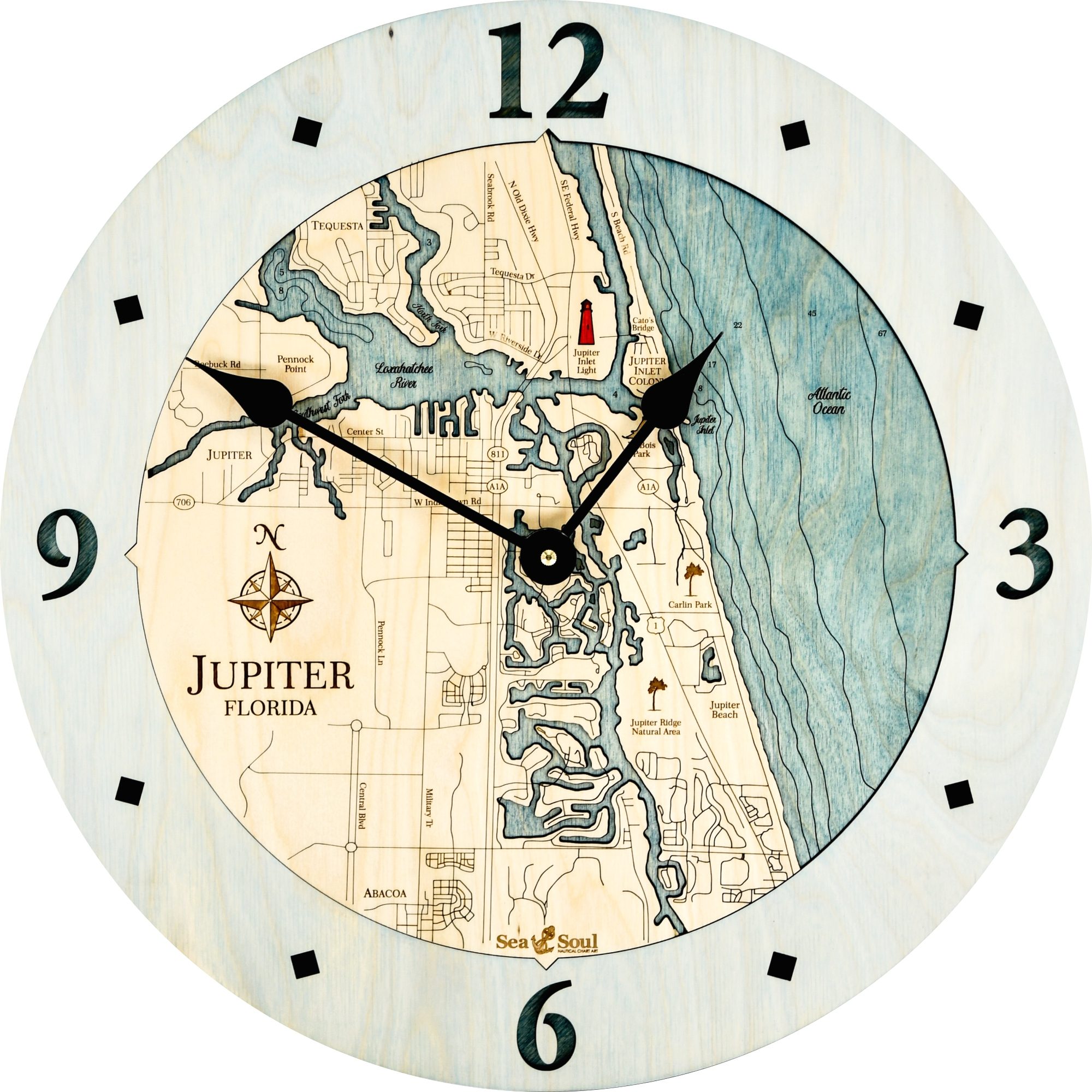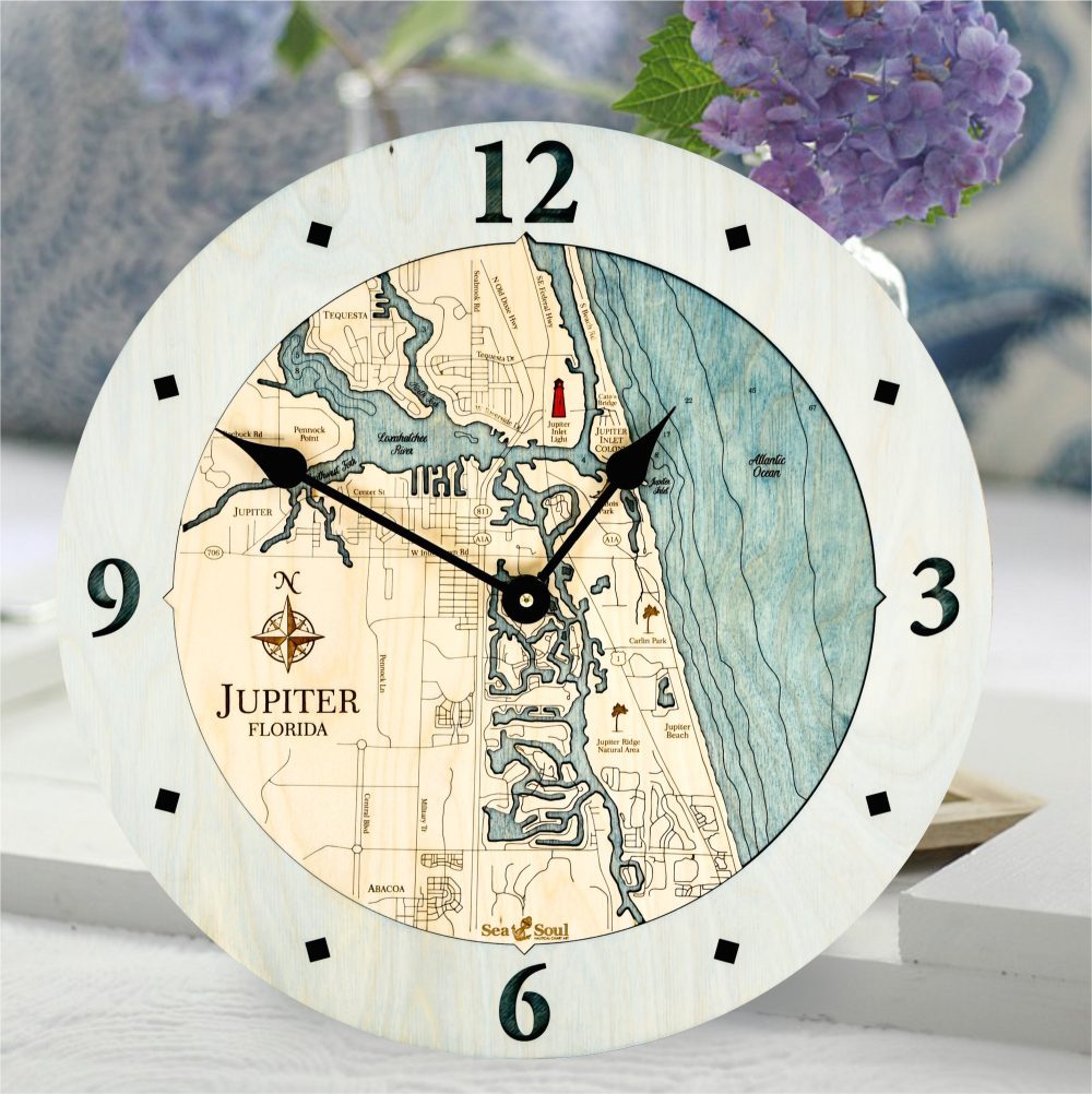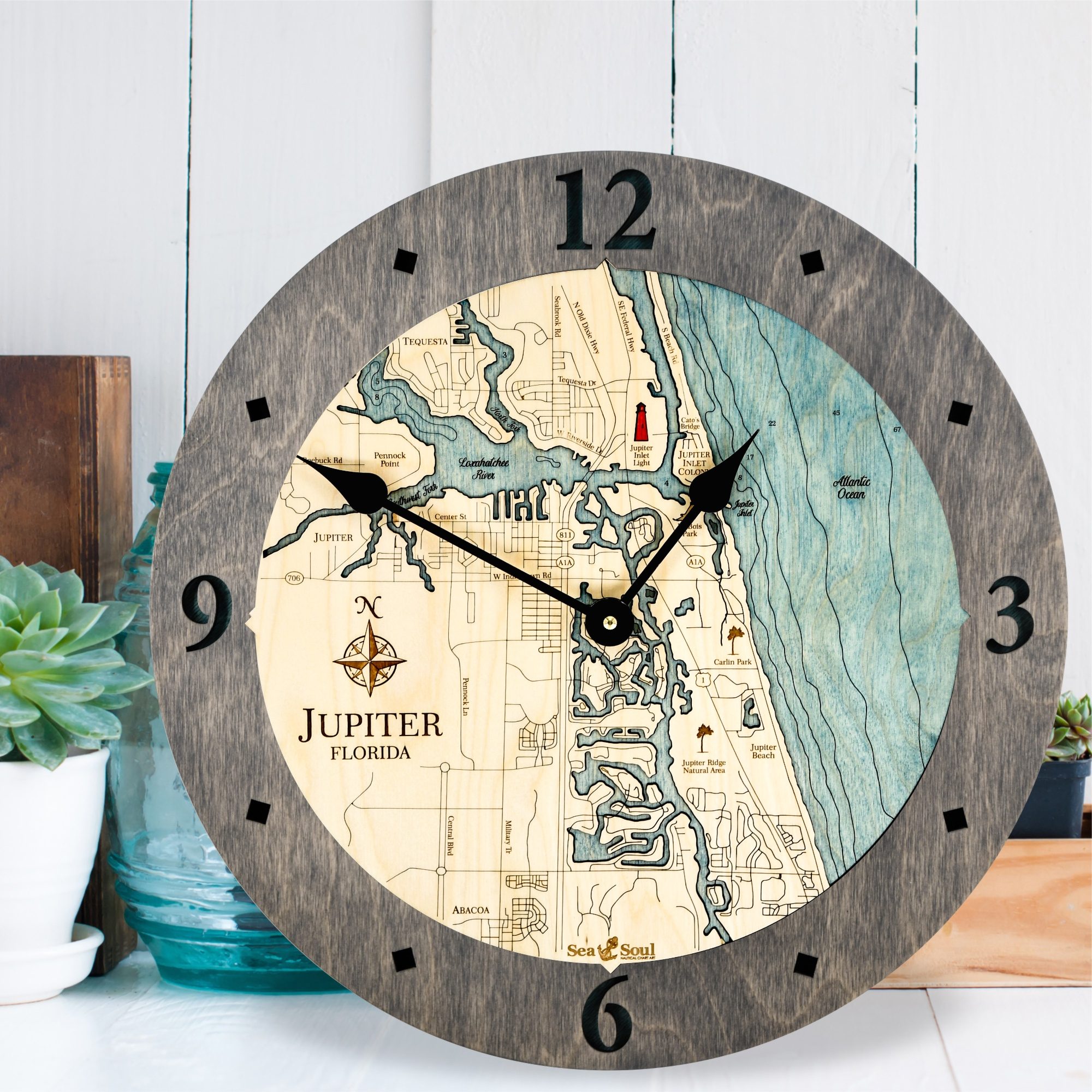 Some clocks aren’t meant for just keeping time!  Sea & Soul’s 24″ Jupiter Nautical Map Clocks truly are a conversation piece and certainly, no better way to add to your coastal décor. They also make the perfect nautical gift for a waterfront wedding or anniversary gift – 5th anniversary is the gift of wood!