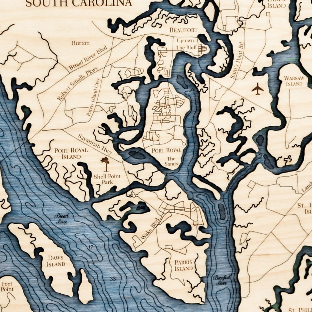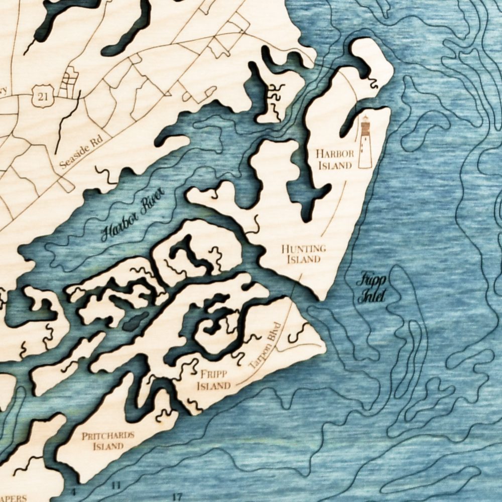 - INTRICATE LASER PRECISION: Each chart laser cut and engraved in intricate detail. Our wood workers then hand stain and assemble the nautical chart with the water depicting the depth contours, three levels below the shoreline.